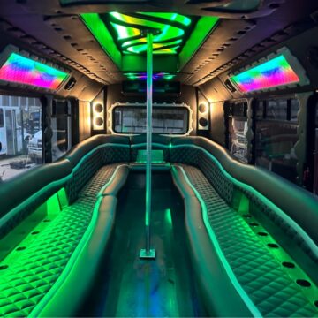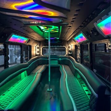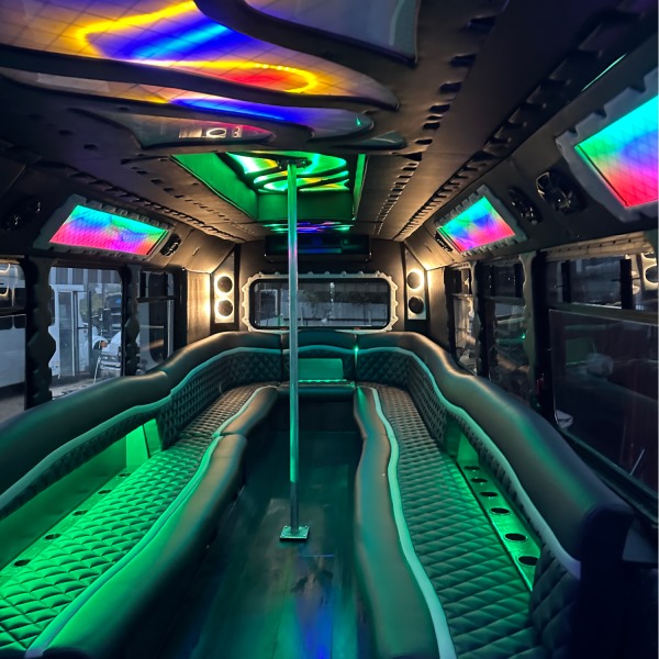 Our birthday party bus features a sleek and modern interior with vibrant LED lighting, a powerful sound system, and spacious leather seating to ensure a lively and comfortable atmosphere. To elevate the party vibe, the bus is equipped with a dance floor, dance poles, and a spacious area for socializing and enjoying the ride.